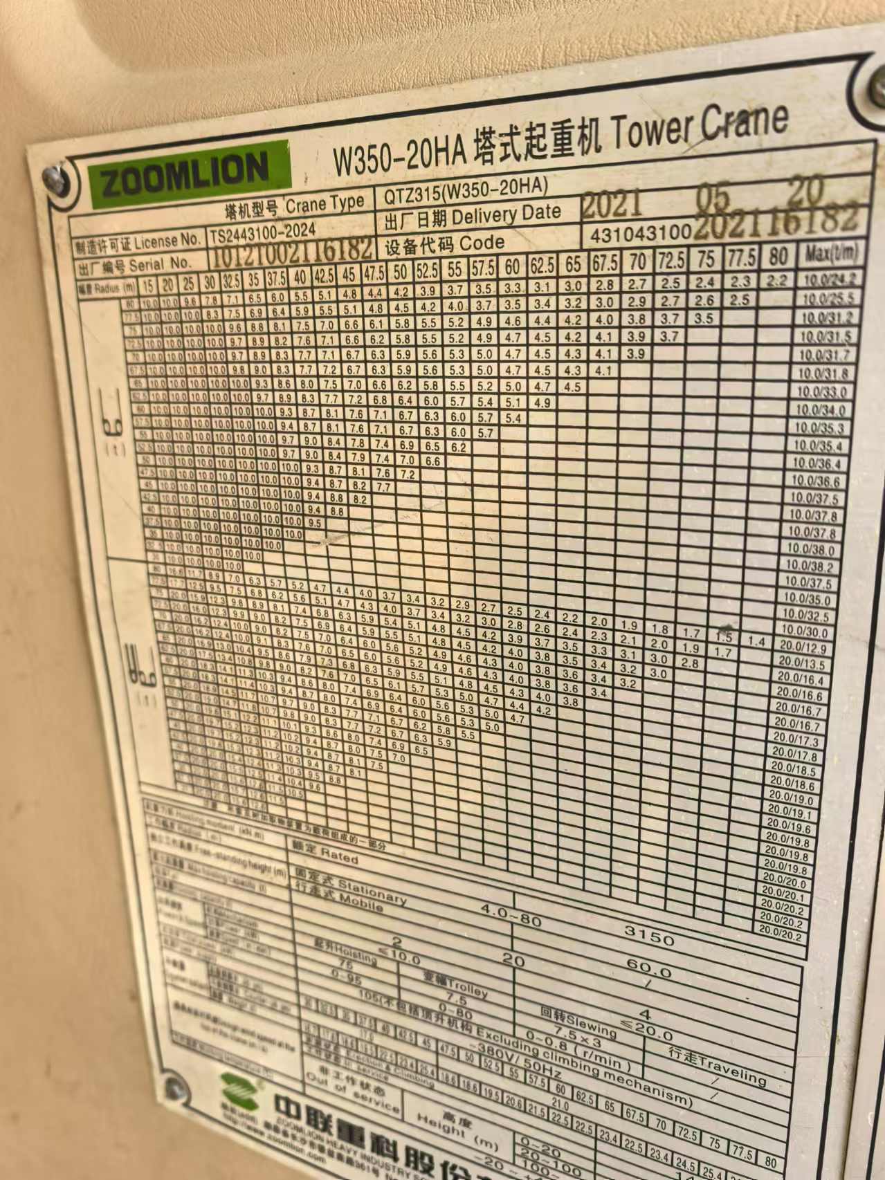 Le Zoomlion WA350-20 est une grue à tour à toit plat qui illustre l'ingénierie des équipements de construction modernes. Lancé en 2020, ce modèle allie une capacité de levage robuste à des caractéristiques opérationnelles polyvalentes, ce qui en fait un atout précieux pour divers projets de construction.