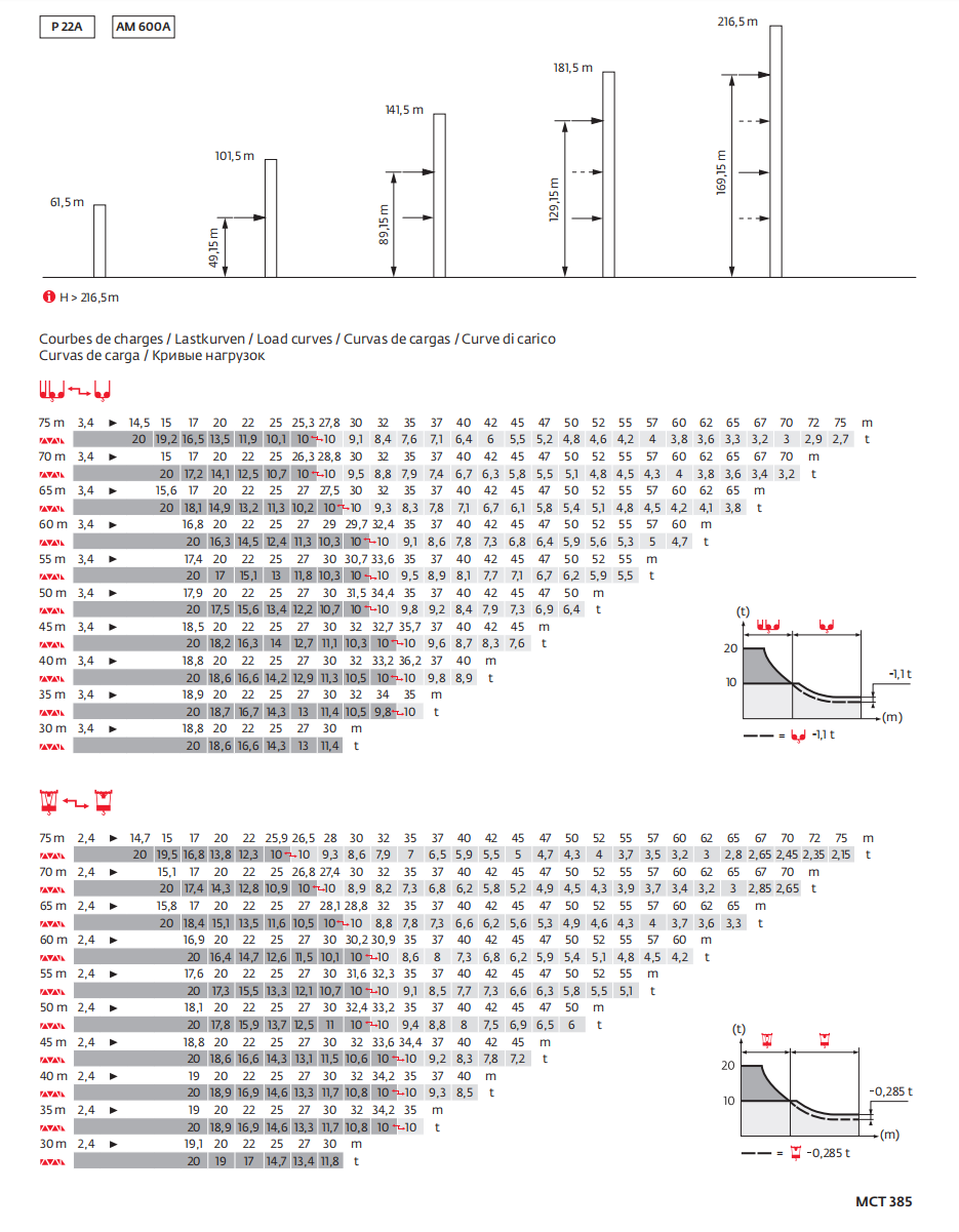 O Guindaste de Torre Potain MCT385 – 20 é um guindaste de torre fabricado pela Potain. Possui capacidade máxima de elevação de 20 toneladas, comprimento máximo da lança de 75 metros e elevação final de 2 toneladas. A torre possui uma seção de mastro padrão de 2 metros, com diversas opções de seção transversal e compatibilidade com fundações existentes, além de configuração de elevação ajustável. A lança é compacta e se encaixa perfeitamente no braço de contrapeso e na cabeça da torre, facilitando o transporte e a montagem.