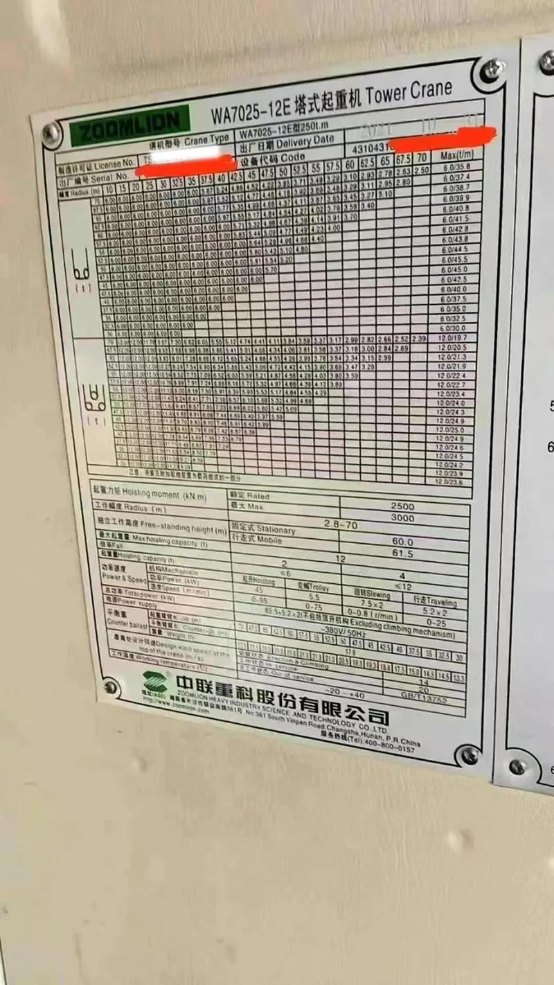 Thông số kỹ thuật của Cẩu tháp Zoomlion 7020-12